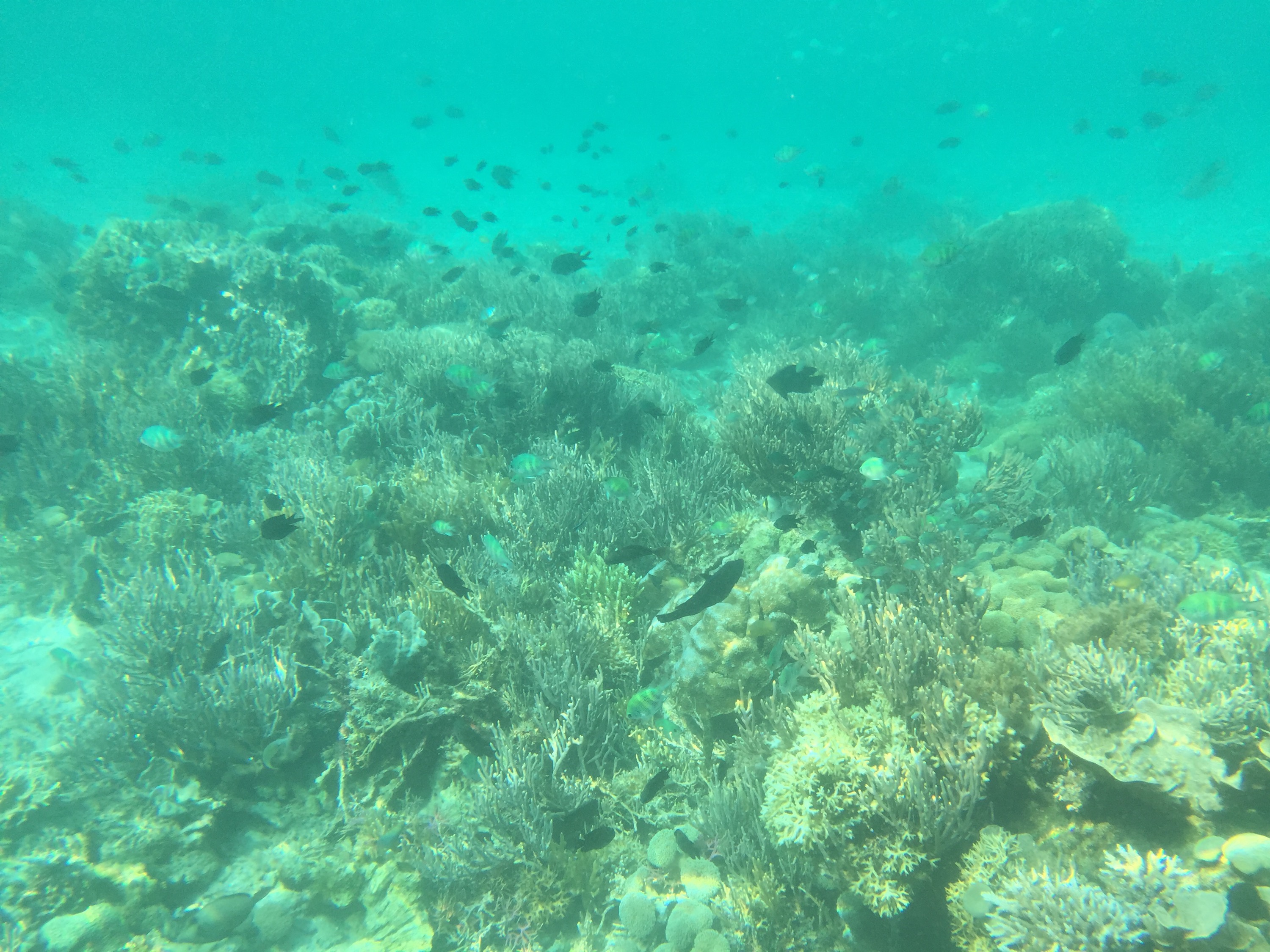 Nach unserem Ausflug nach Rinca sind wir noch schnorcheln gewesen. Zuerst haben wir an einer Stelle gehalten bei der man Schildkröten sehen kann. Und tatsächlich sind uns zwei unter Wasser begegnet. Aber Schildkröten sind bei weitem nicht alles, was man hier finden kann. Man springt ins Wasser und plötzlich ist alles voller Fische und Korallen. Leute, die schon länger in der Gegend tauchen, scherzen über die “Fischsuppe”.