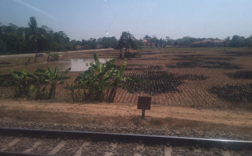 Wir schauen aus dem Fenster und bisher sehen wir viele Reisfelder. Reis findet man hier entweder in überfluteten Nassfeldern oder trocken, so wie die Getreide in Deutschland. Die Nassfelder sehen ungewohnt aus, fast schon ein wenig putzig, wenn man die Bauern beobachtet, die manchmal auf rostigen Maschinen halb im Wasser versunken das Feld beackern. Dazwischen sehen wir viele Gruppen von 5-7 Bauern auf den Feldern arbeiten. Leider sind sie zu weit weg um gute Fotos zu machen.