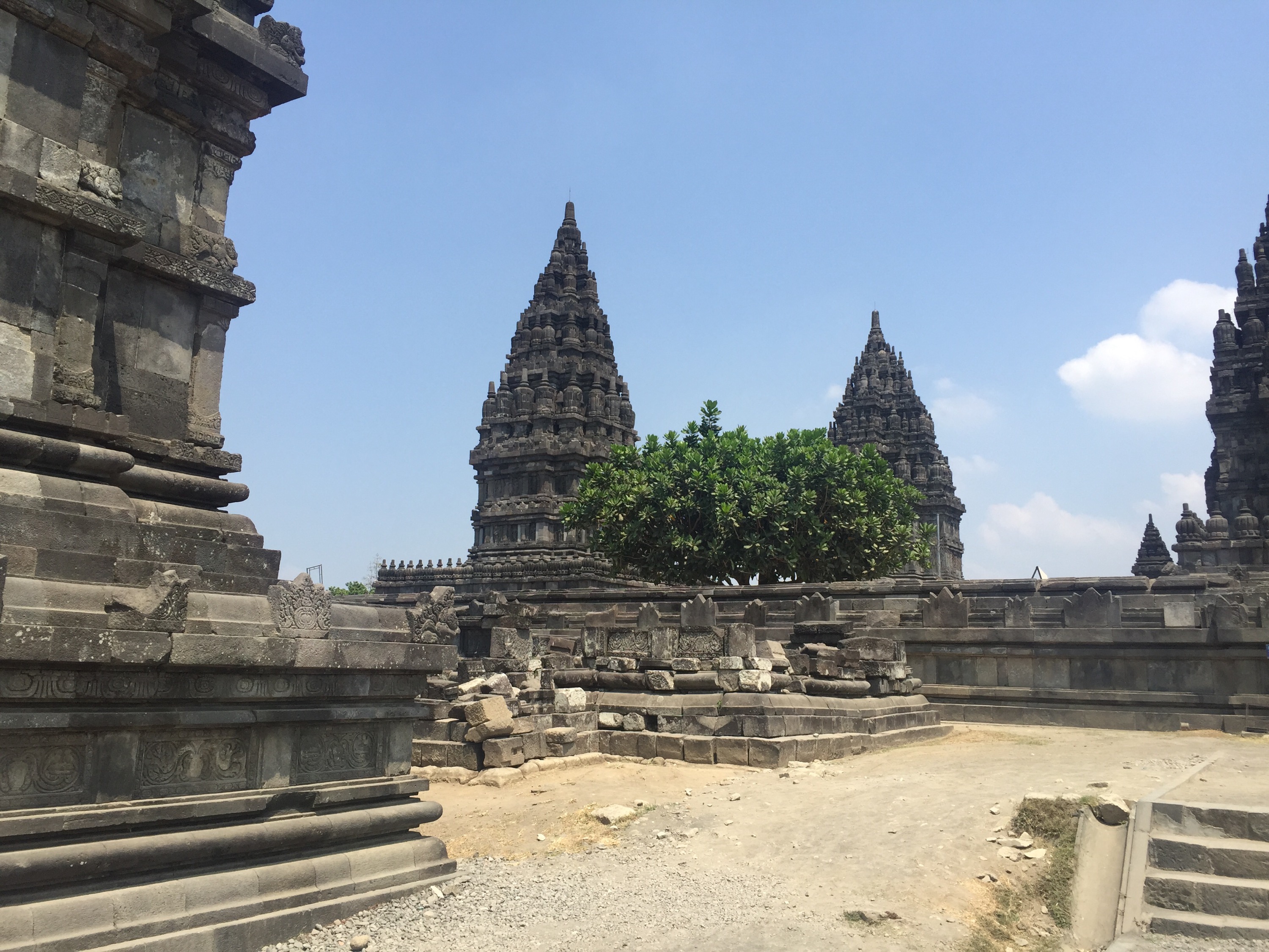 Der andere Tempel scheint hinduistische sowie buddhistische Einflüsse zu haben. Er besteht eigentlich aus einer großen Anlage mit vielen Gemäuern, die sich alle ähneln. Hier ist alles viel größer als in Borobodur und die Gebäude sind auch begehbar. Im Inneren finden sich verschiedene Skulpturen zum Beispiel vom Gott Shiva. Auch an den Rändern dieser Gemäuer sind große Wasserspeier mit runder Öffnung befestigt. Ich rechne jeden Augenblick damit, dass daraus ein paar Kugeln Orichalcium fallen. 😉