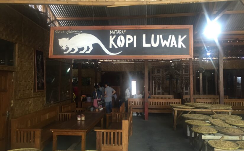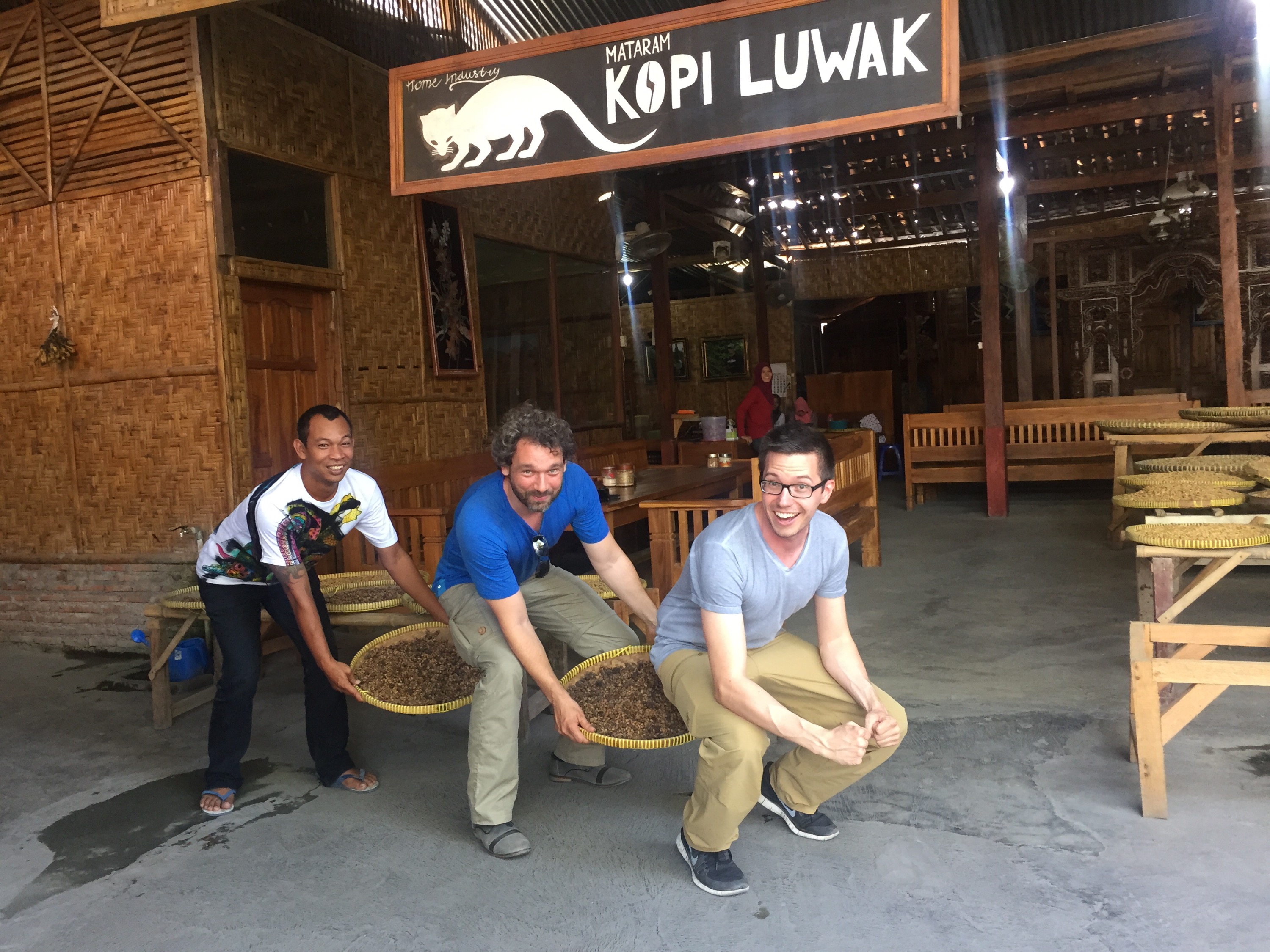 Er läd uns schließlich ein zu sich nach Hause bzw. in seine Nachbarschaft. Wir nehmen ein Taxi und nach 30 Minuten Fahrt kommen wir an. Er zeigt uns die Kaffeerösterei in die er seine Kaffeebohnen bringt. Die Bohnen werden jedoch zuvor auf seiner Farm von Luwaks gefressen und wieder ausgeschieden. Der so entstandene Kaffee ist sehr lecker und sehr mild. Er heißt Kopi luwak.