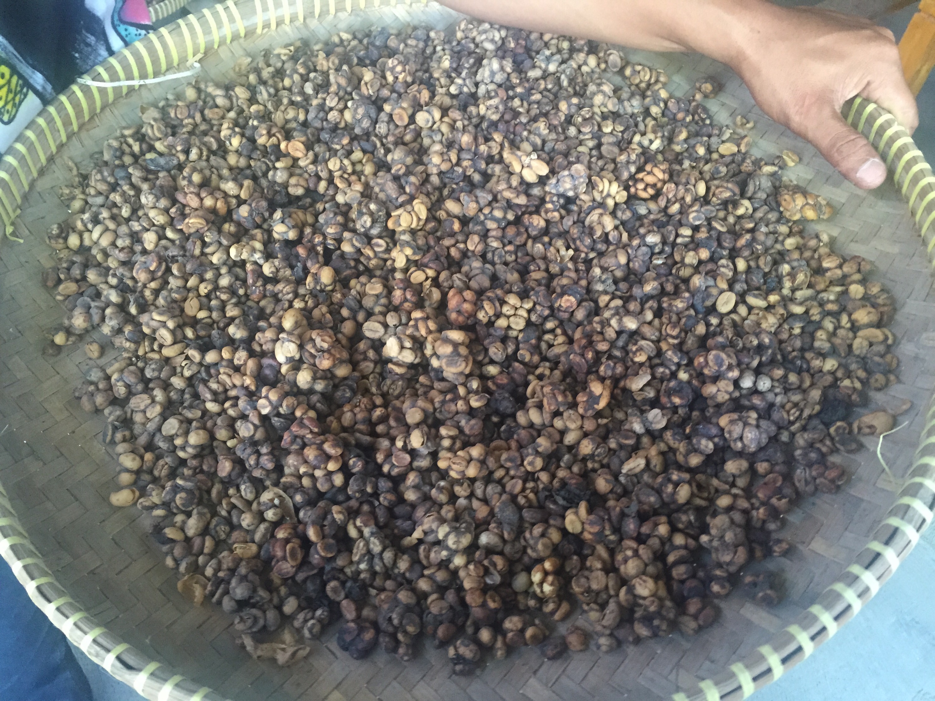 Die Bohnen werden zuerst gereinigt und dann von Hand geschält. Anschließend werden sie in der einzigen kleinen Röstmaschine zu den bekannten schwarzen Kaffeebohnen verarbeitet. Wir haben ein bisschen beim Schälen geholfen.